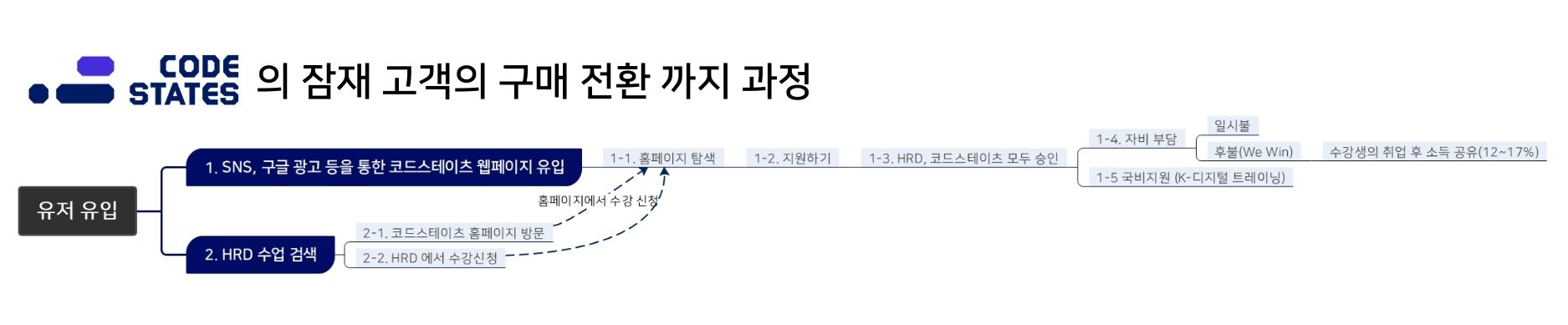 그렇다면 코드스테이츠 매출에 기여하는 가장 중요한 기능은 무엇일까? 물론 학원이기때문에 "강의 제공"이 가장 주다. 수강생은 강의를 보고 지불하기 떄문이다. 그런데 코드스테이츠는 단순히 잠재적 수강생과의 일대일 관계가 아니라, 중간에 고용노동부, 기업이 함께 들어가있다. 가령, 기업은 일정 수수료를 내고 코드스테이츠의 수강생/졸업생을 매칭받을 수 있고, 이 수수료를 코드스테이츠가 취할 수 있다. 그렇지만 이 부분은 기본적으로 수강생 풀이 마련된 이후에 가능한 부차적인 방법으로, 주 매출에 기여하는 잠재 수강생들의 구매 전환 프로세스를 주로 살펴보겠다.