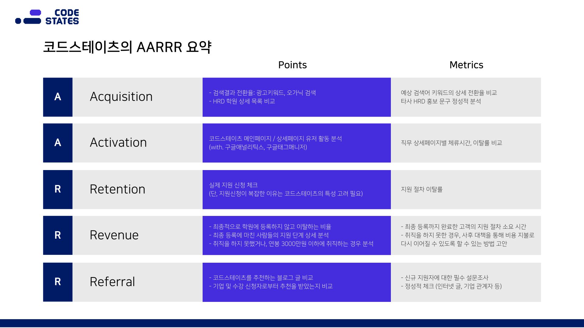 결론적으로, 코드스테이츠의 AARRR의 지표는 "웹사이트 방문, 수강 지원, 수강생의 취업"이라고 볼 수 있다. 이를 바탕으로 AARRR을 정리하자면 아래와 같다.